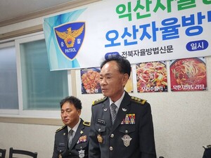 익산시자율방범연합대 오산지대(지대장 김영우)는 시연합대 임원들과 상견례를 통해 화합과 소통의 자리를 가졌다.지난 16일 오산면에 소재한 취향에서 진행된 이번 상견례에는 경세광 연합대장을 비롯해 각 지역 지대장들과 시 연합대 임원들이 참석해 오산지대 대원들과 인사를 나눴다.이날 상견례는 앞으로 진행될 연합대 관련 행사에 적극 참여해 달라는 정진정 사무처장의 당부와 향후 연합대 계획에 대한 설명의 자리로 진행됐다. 경세광 연합대장은 "오늘 이렇게 뜻깊은 자리를 마련해 준 김영우 지대장과 대원들께 감사드린다"며 "법정단체로서 자율방범대의
