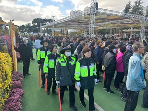 익산시자율방범연합대(연합대장 경세광)가 24일부터 다음달 2일까지 중앙체육공원에서 개최된 '제22회 익산천만송이 국화축제'에 안전지킴이로서 역할을 충실히 수행하고 있다.연합대는 축제 개막 첫날 오전 9시부터 밤 10시까지 각 지대에서 파견된 대원 100여 명을 행사장 내부 순찰과 신흥공원 일대 주차장 통제에 투입해 안전한 축제가 될 수 있도록 최선을 다하고 있다.특히, 개막 첫날 마감전 6세 아동의실종 신고를 받고 대언들을 긴급 투입해 신고 분만에 실동 아동을 발견해 부모에게 인계하는 기지를 발휘했다.아울러, 자율방범대 부스에 정헌