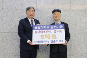 국내 최초로 ‘유언대용신탁기부’를 시작해 기부를 이어오고 있는 권준하(81) 신익산화물터미널 대표가 원광대학교(총장 박성태)에 발전기금 5억 원을 역시 유언대용신탁으로 기부했다.지난 21일 박성태 총장을 만난 권준하 대표는 “학생들이 공부도 좋지만, 조금이라도 건강해졌으면 하는 바람으로 ‘등산장학금’을 만들어 등산을 실천하는 학생들에게 쓰이면 좋겠다”며 기부 취지를 설명하고, “학생들이 졸업 후 사회에 나가면 지식과 함께 건강한 신체도 중요하다”고 강조했다.이에 박성태 총장은 “지역 사랑과 더불어 후학 양성에 큰 관심을 보여 주신