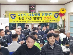 익산시자율방범연합대(연합대장 경세광)는 용동자율방범지대(지대장 황호청)과 함께 상견례를 통한 소통의 자리를 마련했다.지난 6일 용안면에 소재한 우리들가든에서 진행된 이번 행사는 용동자율방범지대가 주관하여 연합대 임원들과 용동지대원들 간 소개의 자리가 마련됐다.이날 행사에는 익산시 연합대에서는 경세광 연합대장을 비롯해 정진정 사무처장, 안태규 부대장,장민 부대장, 손형주 사무국장 및 임원들과 각 지역 대장들이 참석해 용동지대원들과 인사를 나눴다.아울러, 정진정 사무처장은 올해 실시되는 군산 국제마라톤 대회와 서동축제 등 지역행사에 대