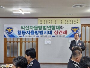 익산시자율방범연합대 오산지대(지대장 김영우)는 시연합대 임원들과 상견례를 통해 화합과 소통의 자리를 가졌다.지난 16일 오산면에 소재한 취향에서 진행된 이번 상견례에는 경세광 연합대장을 비롯해 각 지역 지대장들과 시 연합대 임원들이 참석해 오산지대 대원들과 인사를 나눴다.이날 상견례는 앞으로 진행될 연합대 관련 행사에 적극 참여해 달라는 정진정 사무처장의 당부와 향후 연합대 계획에 대한 설명의 자리로 진행됐다. 경세광 연합대장은 "오늘 이렇게 뜻깊은 자리를 마련해 준 김영우 지대장과 대원들께 감사드린다"며 "법정단체로서 자율방범대의