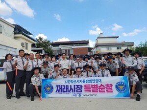연일 뜨거운 날씨에도 불구하고 시민들의 안전한 일상을 위해 정기적인 자율방범대의 활동이 이어져 귀감이 되고 있다.익산시자율방범대연합대(연합대장 경세광)는 재래시장 특별순찰의 일환으로 지난 24일 오후 3시부터 북부시장 일대에서 연합회 산하 각 지대 대원 들이 참석한 가운데 전통시장 5일장 특별순찰을 전개했다.연합대는 6인 1조 8개조로 나눠 이날 약 1시간 동안 북부시장 장날에 맞눠 시장 일대를 돌며 시민 안전과 범죄예방을 통한 살기 좋은 익산시의 이미지 제고를 위해 땀을 흘리며 순찰했다.자율방범대의 재래시장 특별순찰은 경세광 연합