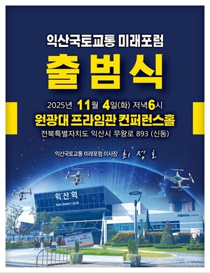 최정호 전 국토교통부 차관이 정책포럼 발족과 함께 본격적인 정책 행보에 나선다.‘익산국토교통 미래포럼(이사장 최정호) 출범식’이 오는 11월 4일 오후 6시 원광대학교 프라임관 컨퍼런스홀에서 개최된다.이번에 출범하는 ‘익산국토교통 미래포럼’은 국토교통·도시경영 전문가인 최정호 전 차관이 이사장을 맡고 각 분야 정책 전문가, 시민 등이 참여한다.포럼은 익산의 도시 경쟁력 강화 및 미래발전을 이끌 핵심 정책 아젠다 개발에 역량을 집중할 계획이다.특히 인공지능(AI) 등 신산업 육성을 비롯해 청년·일자리, 도시계획·도시디자인, 익산 미래