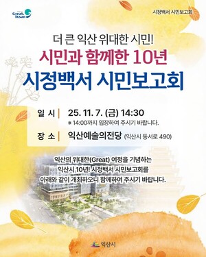 정헌율 익산시장은 민선 6~8기 동안 시민과 함께한 10년의 여정을 기념하기 위해 오는 7일 익산예술의전당 대공연장에서 '더 큰 익산, 위대한 시민! 시민과 함께한 10년' 시민보고회를 개최한다.4일 익산시에 따르면 이번 보고회는 지난 10년간의 시정 성과를 담은 시정백서 발간을 기념해, 시민과 함께 이룬 성과를 되돌아보고 익산의 미래 비전을 공유하기 위해 마련됐다.행사는 시립예술단의 식전공연을 시작으로 △익산 10년 성과 주제영상 상영 △명예시민 표창 △시정백서 시민보고회 △기념 퍼포먼스 순으로 진행된다.특히 시민보고회에서는 정헌