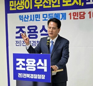 “익산시 26만 7천여 명의 전 시민에게 1인당 100만 원씩 민생지원금을 지급하겠습니다.”조용식 내년 6월 3일 지방선거 익산시장 출마 예정자가‘임기 내 전 시민 1인당 100만 원 민생지원금 지급’을 첫 번째 공약으로 발표했다.전북경찰청장을 역임한 조 출마예정자는 12일 익산시청 브리핑 룸에서 기자회견을 열고“내년 6월 지방선거에서 민주당 간판을 내걸고 익산시장에 당선되면, 시 조례를 제정하고 시의회 예산 의결을 통해 임기 4년 동안 전 시민에게 1인당 100만 원의 민생지원금 지급 하겠다”고 약속했다.조 출마예정자는 “이 같은