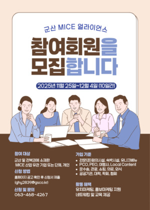 군산새만금컨벤션센터(GSCO)는 지역 MICE 산업 활성화 및 국제회의 유치 경쟁력 강화를 위해 「2025 군산 MICE 얼라이언스(이하 GMA)」 신규 회원사를 모집한다.GMA는 국내외 대형 학회 및 컨벤션 유치를 위해 구축한 민·관 협의체로, 군산시와 전북권 MICE 기관·기업이 함께 구성되어 있다.현재는 ▲국제회의 유치 기반 확대 ▲지역 네트워크 강화 ▲군산의 로컬 콘텐츠 경쟁력 강화를 위해 지역 기반 기업은 물론, 로컬 특화 프로그램을 운영하는 개인도 가입할 수 있도록 참여 범위를 더욱 넓힌 것이 특징이다.신규 회원 모집 분