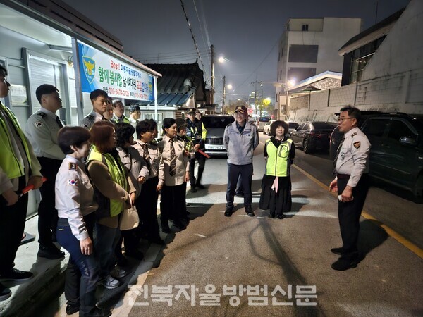 익산시자율방범연합대 마동자율방범지대(대장 왕갑희)가 지난 11일 마동 행정복지센터가 평화지구대,와 함께 야간 합동 순찰에 나섰다.