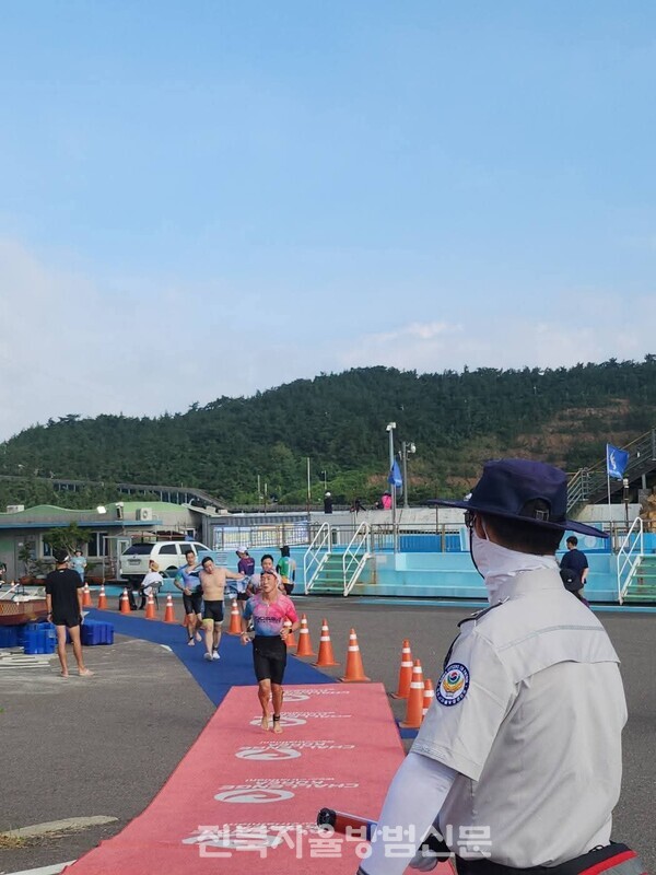 올해도 여지없이 뜨거운 여름 작열하는 태양 아래 인간의 한계에 도전하는 철인들의 안전을 위해 하루 종일 경기장 일원을 지킨 자율방범대의 봉사활동이 화제다.