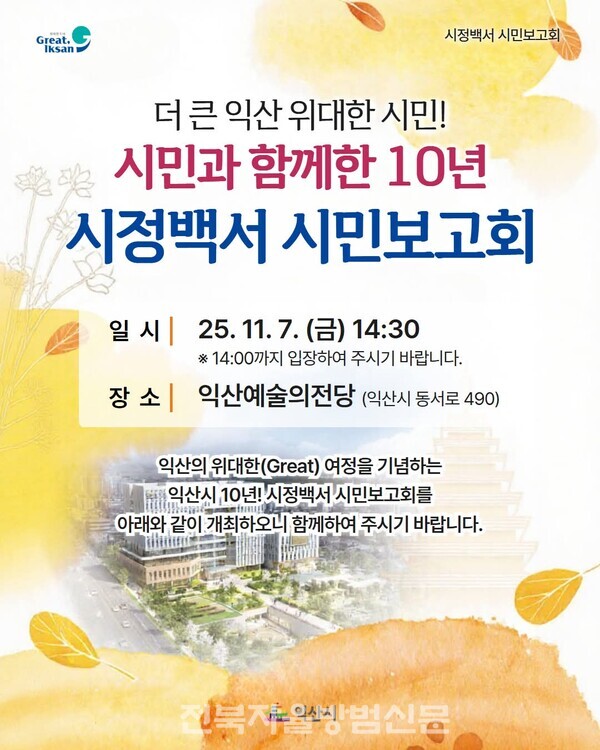 정헌율 익산시장은 민선 6~8기 동안 시민과 함께한 10년의 여정을 기념하기 위해 오는 7일 익산예술의전당 대공연장에서 '더 큰 익산, 위대한 시민! 시민과 함께한 10년' 시민보고회를 개최한다.