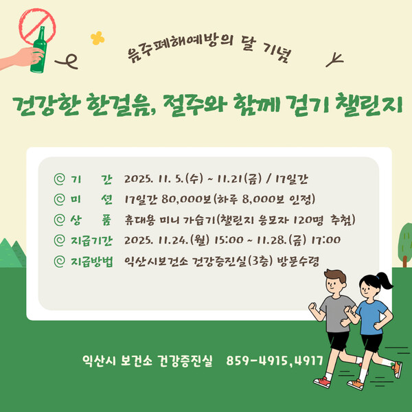 익산시 보건소는 '11월 음주폐해예방의 달'을 맞아 5일부터 '건강한 한 걸음! 절주와 함께 걷기 챌린지'를 추진한다.