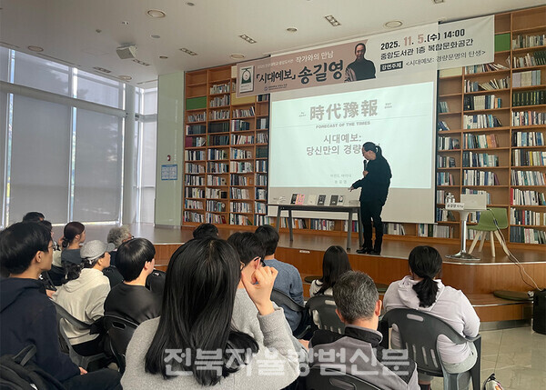 원광대학교(총장 박성태) 중앙도서관은 지난 5일 도서관 복합문화공간에서 빅데이터 전문가로, 베스트셀러 ‘시대예보’의 저자 송길영 작가를 초청해 ‘시대예보 : 당신만의 경량문명’을 주제로 하는 작가와의 만남 행사를 개최했다.