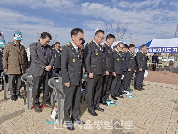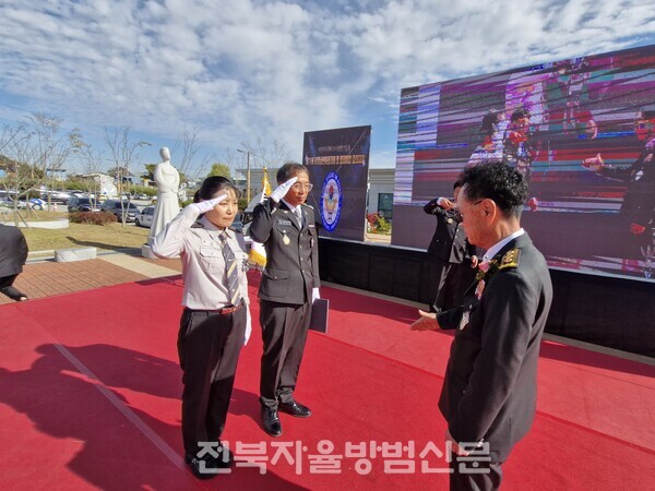 식전공연(난타) 행사 시작 전 기수단 입장 준비 기수단 입장 기수단 입장 후 도열 기수단 도열 개회선언 (이윤구 도 연합회 자문위원) 국민의례 국민의례 기념식 전경 자율방범대 임원들이 묵념을 하고 있다 김관영 도지사를 비롯한 내빈들이 묵념을 하고 있다 경세광 전북특별자치도연합회장 인사 유공대원 시상(중앙회장 표창) 유공대원 시상(도지사 표창) 유공대원 시상 (전북청장 감사장) 유공대원 시상(도 자치경찰위원장 감사장) 도 연합회장 시상( 도 연합회장 표창) 대회사 (경세광 도 연합회장) 격려사 (김태국 대한민국중앙회장) 축사 (김관영 전북특별자치도 도지사) 축사 (정헌율 익산시장) 우리의 결의 우리의 결의 익산시연합대 전호갑,최정옥 대원이 우리의 결의를 선언하고 있다 자율방범대가 제창 기념사진