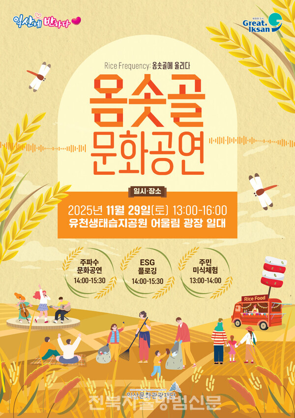 쌀로 이어지는 따뜻한 진동과 그 안에 담긴 치유의 주파수를 주제로 한 옴솟골 문화공연은 ‘쌀’을 매개로 한 나눔과 ESG 생활 실천, 음악 힐링을 결합한 복합 문화행사로, 유천생태습지공원이 지닌 상징성을 문화적 경험으로 확장해 주민이 서로의 정을 나누고 함께 어우러지는 시간을 마련한다.