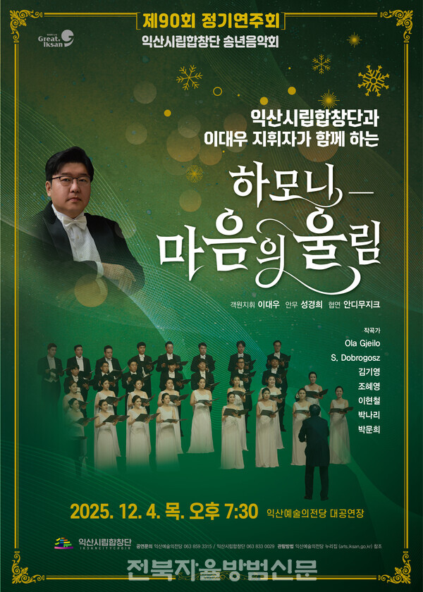 익산시립합창단은 12월 4일 오후 7시 30분, 제90회 정기연주회 '하모니-마음의 울림'을 익산예술의전당 대공연장 무대에 올린다.
