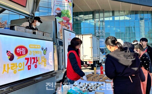 종합식품기업 ㈜하림(대표이사 정호석)이 지난 21일 KBS전주방송총국 시민녹지광장에서 열린 '2025 사랑의 김장나눔 축제'에 후원 기업으로 참여하고 임직원 봉사활동을 펼치며 지역 사회에 따뜻한 온기를 전했다고 24일 밝혔다.