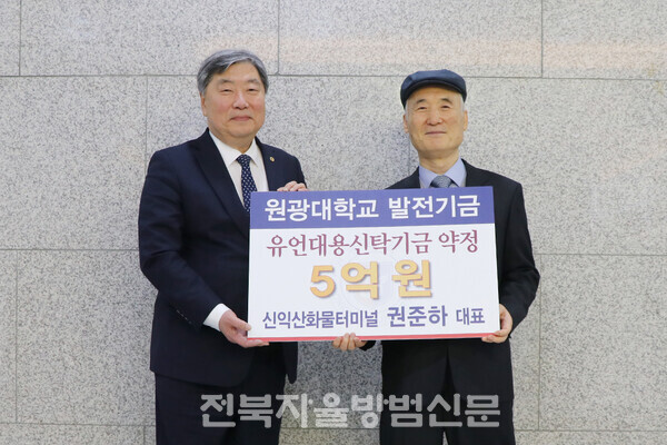 국내 최초로 ‘유언대용신탁기부’를 시작해 기부를 이어오고 있는 권준하(81) 신익산화물터미널 대표가 원광대학교(총장 박성태)에 발전기금 5억 원을 역시 유언대용신탁으로 기부했다.