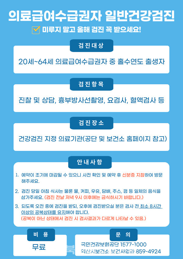 익산시는 12월 31일까지 진행되는 '의료급여수급권자 일반건강검진'과 관련해 아직 검진을 받지 못한 대상자들에게 검진을 받을 것을 당부했다.
